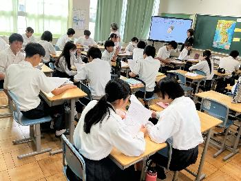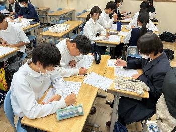 近くの仲間と一部ハングルで交流しながら終始和やかに授業が進みました。今年度中に2,3年生全クラスで実施予定です。皆さんお楽しみに。