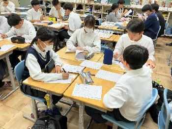 1年生は舞台発表がなく、万博記念公園での校外学習についてはがき新聞を作成し、展示発表をしました。