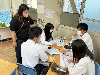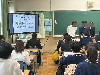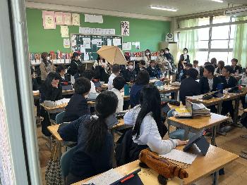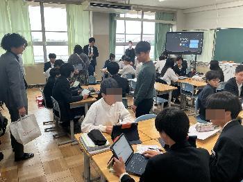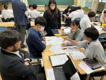 写真から一目瞭然ですが、生徒の皆さんの真剣な議論に、先生方も興味津々。ほぼマンツーマンに近い人数で授業観察されました。きっと生徒の皆さんもいつもとは違う雰囲気にずいぶん緊張されたと思います。そんな状況にも物怖じせず、堂々と自分の意見を発表する姿には、出身小学校の先生方も(たくさん見に来てくれていましたので)鼻が高かったのではないでしょうか!?