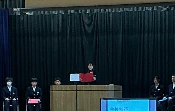 校長先生から1学期の終業式で話した「3つのお願い」の再確認がありましたが、夏休み中に大きなトラブルの報告もなかったため、一中生が誠実に、すこやかに夏休みを過ごしてくれたことと喜ばしく思います。中には事件の被疑者逮捕に大いに貢献したとして、警察署長から表彰を受ける生徒もおりました。学校としても非常に誇り高いことでした。