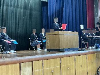 夏休み中のクラブ活動の表彰が行われました。卓球、バドミントン、バレー、水泳、野球、吹奏楽、ソフトテニス部が大会で優秀な成績を収め表彰されました。