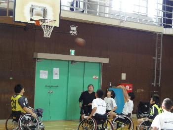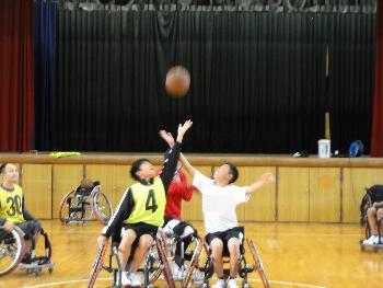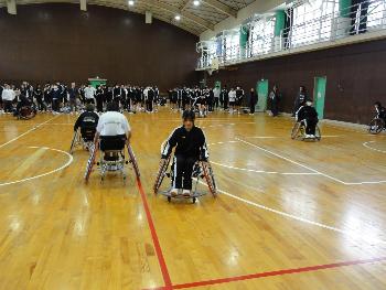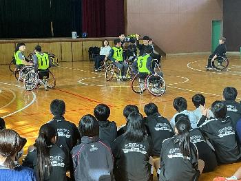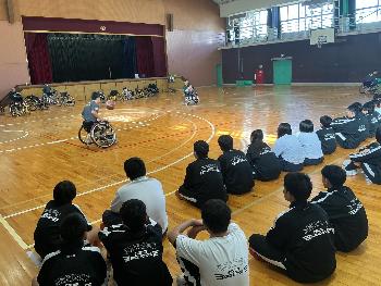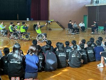 先生によるデモンストレーション、代表生徒の車いすバスケ体験など、身近な人々の様子に生徒たちも大興奮。シュートが放たれるたびに大歓声が上がります。しっかし、なかなか入りませんなあ。座ったままボールを投げあげることがどれだけ難しいことか…。車いすを推し進めることがどれだけ重労働か…。最後は全員が車いすに乗ってリレー体験をしたので、生徒たちは身をもって感じることができたと思います。