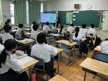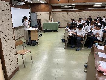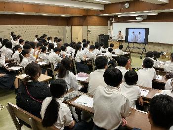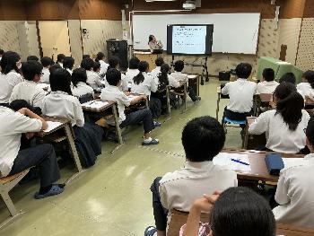 1年生を対象としたものでしたが、小学校時代に一度講演を聞いたことのある生徒もおり、井上さんから「覚えてくれてるかわからないけど…」と前振りのあった質問に対して即座に解答するなど、小学校時代の学習が定着している様子が見られました。