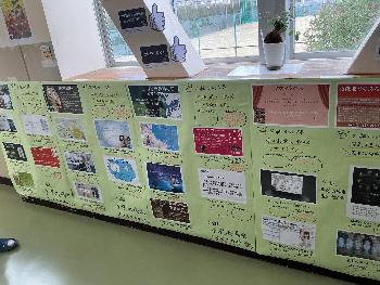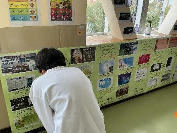 休み時間はそんな熱い想いに誘われた生徒が興味深そうに作品を眺めています。読みたくなった生徒は近くに設置してあるシールを一枚手に取り、その作品に投票できる仕組みです。中には「読みたい」のシールが、枠いっぱいになっている作品も。読みたくなった本は一中の図書室に配架されています。
