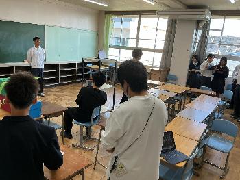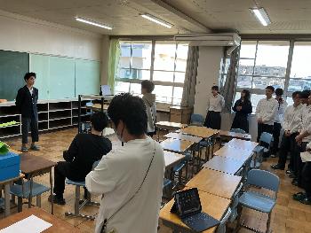 事前に準備をしてくれたプレゼン資料を用いながら、高校生活の様子について校時帯・制服・食堂のメニュー・テストの科目数・校則・行事(体育祭や文化祭)などの情報をとても分かり易く紹介してくれました。