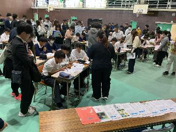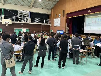 2年生有志の皆さん以外にも、当日の体育館の会場設営&片付けに1年から3年のほぼすべてのクラスの生徒が協力してくれました。まさに学校を挙げての万全の準備のおかげで、市内からたくさんの先生方にご参加いただき、素晴らしいご助言や、お褒めの声をいただく機会を得ることができたのです。