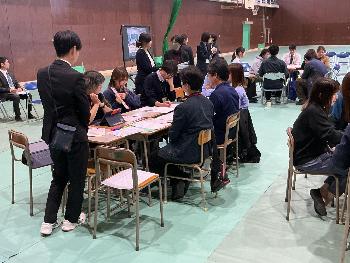 授業後には先生たちの勉強会が始まります。「グラフと表を見比べて意見がより深まっていた」「複数の資料を参考に主体的に意見を述べていた」などなど、1年2組の皆さんの積極的に学習に取り組む姿を、参加した先生方からたくさん評価していただきました。さらに、当日は摂津市の教育長もお忍びで参観に来られており(元中学校の数学の先生です)、授業の様子をご覧になられて「言うことなし!!素晴らしい授業だ!!」とお褒めいただきました(そのあとどこが良かったのかを詳しく助言いただいております)。一中として生徒たちが主体的に学習内容を進めていく授業形態を研究してまいります。そして、複数の資料を参考にしたり、足りない情報を集めたり、分からない部分を他者と補い合って解決していけるような実社会で活躍できる資質・能力の育成をめざします。
