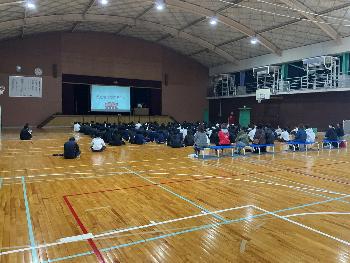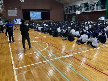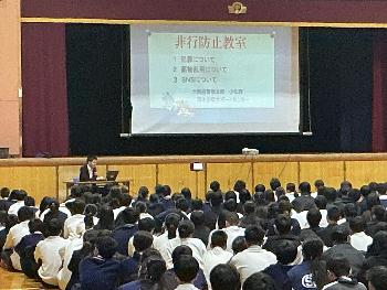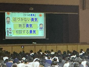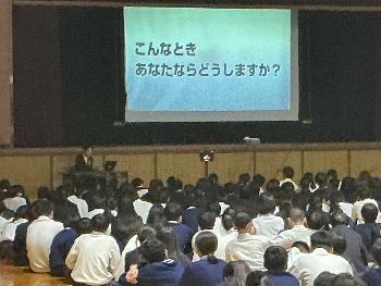 「窃盗」「薬物」「SNS」3つのテーマで中学生が巻き込まれやすい犯罪について丁寧な説明がありました。14歳で大人と同じように刑事事件として扱われ、逮捕されるということ、知識がなかったために罪を犯してしまう可能性、いろいろなケースを例に知識の伝達がありました。講演の最後に「こんなとき あなたならどうしますか」と呼びかけがありました。一人ひとりが、責任ある大人として考えなければならない年齢(14歳)を中学時代に迎えます。この経験が一人ひとりの幸せな未来につながってくれることを願っています。