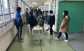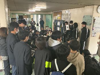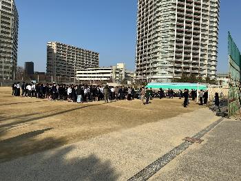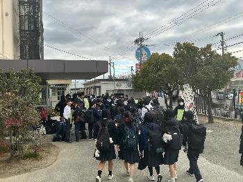 体育館で学年集会を終え、家路につく3年生にむけて、明日の入試で持てる力を発揮できることを願って、後輩たちからエールが送られました。はにかみながら通り抜ける人、後輩と会話を交わす人、ハイタッチで通り過ぎる人、反応は様々ですが、学年集会で緊張した面持ちだった3年生の表情も、少し和らいだようでした。