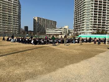 突然の開始にもかかわらず、生徒たちはそれぞれの場所で身を守る行動をとり、揺れが収まったことを知らせる放送を聞いてから、落ち着いて避難を始めることができました。授業中に行う避難訓練とは異なり、戸惑いもあったことと思いますが、大きな混乱はなく、約600名の生徒の点呼は5分30秒で完了しました。