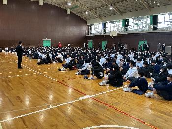 校長先生からは、「まずは自分の身を守る行動(自助)を最優先にし、余裕があれば周りの人を助ける行動(共助)を考えてほしい」との呼びかけがありました。また、避難時の合言葉「おはしも(おさない・はしらない・しゃべらない・もどらない)」に、「て(低学年を優先して)」を加えた本校独自のキーワード「おはしもて」が紹介され、中学生が地域の防災を支える存在であることについてお話がありました。