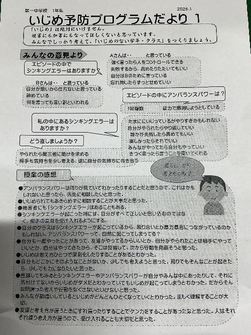 第1学年では全3回シリーズでいじめ予防プログラムを実施しました。身のまわりにある「シンキングエラー」や「アンバランスパワー」を知り、自分たちの行動や思考を客観的に見つめなおす機会になりました。