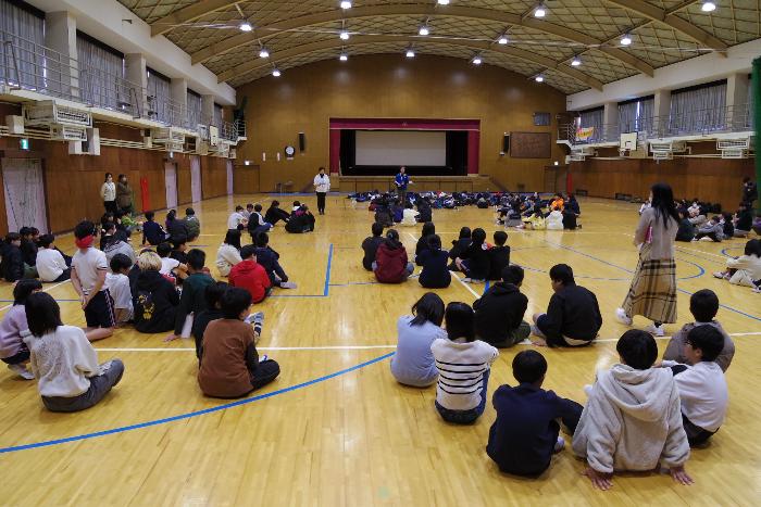 6時間目に1年生が体育館で「交通安全教室」の授業を受けました。