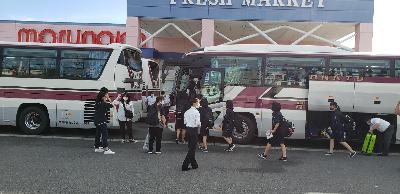 台風10号の影響が懸念されましたが、雨も上がって、当初予定から5分遅れて無事出発しました。新型コロナウィルス感染症対策でバスを6台に増やしたため、近くのスーパーの駐車場をお借りしての出発となりました。