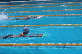 ビート板を使っての対決です、がんばれ!