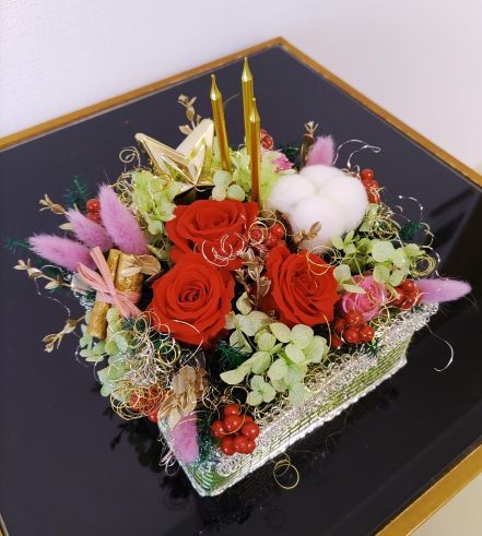内容:生花を加工して長く楽しめるクリスマスのプリザーブドフラワーを作る