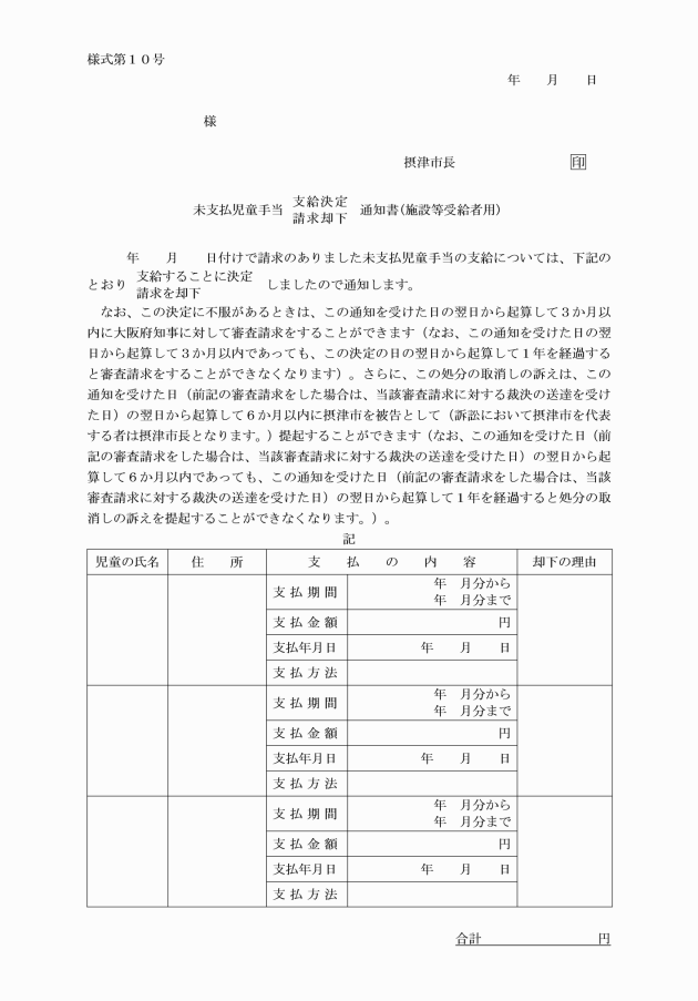 (10) 未支払児童手当支給決定・請求却下通知書(施設等受給者用)(様式第10号)