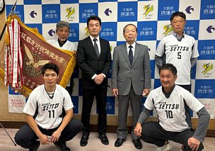 本日、大阪府総合体育大会(サッカー 一般男子の部)で見事優勝を果たした摂津市サッカー連盟・コサリFCの方々が報告に来てくれました!