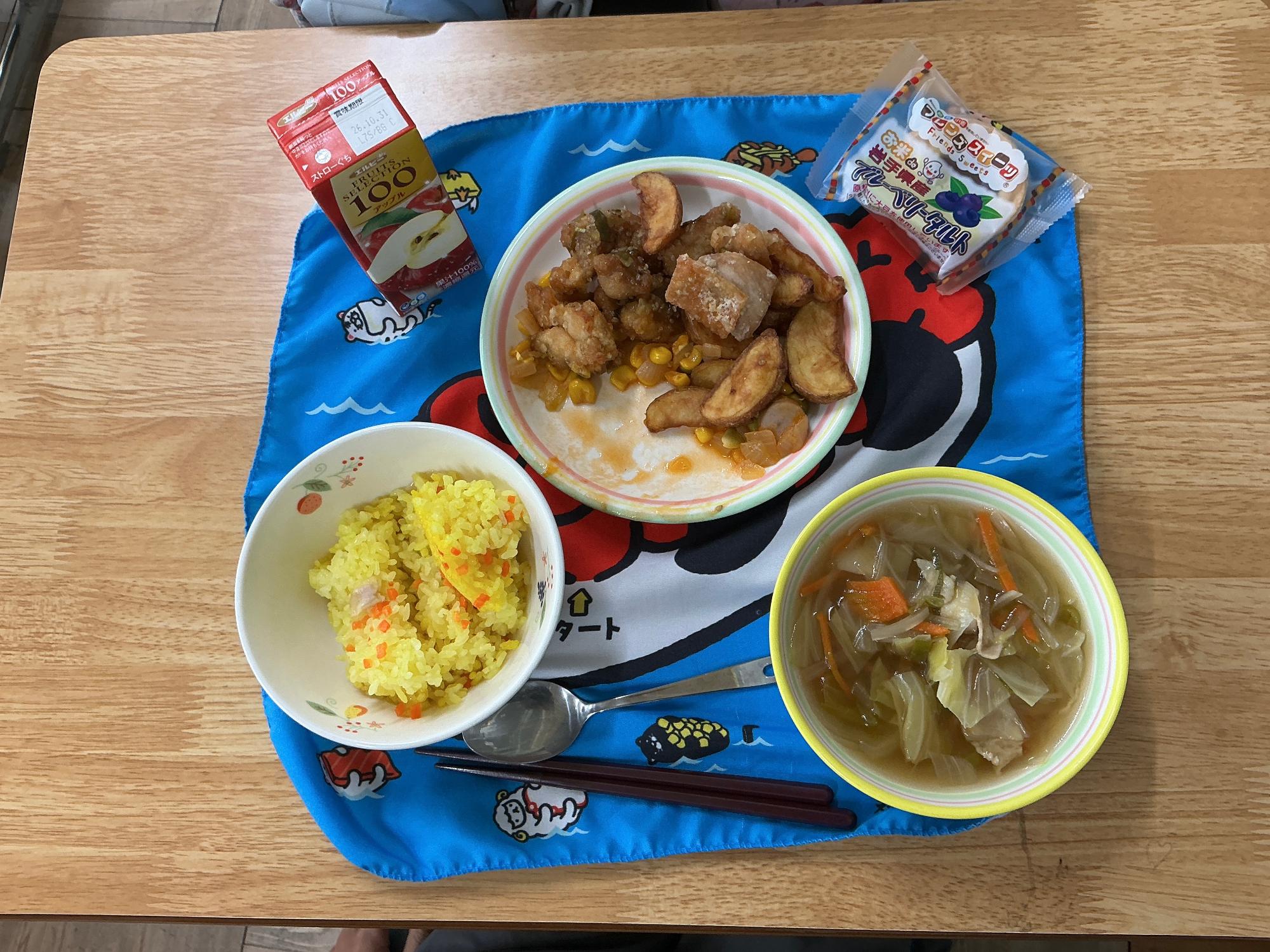 玉ねぎピラフ、豆腐と野菜のスープ、鶏肉の竜田揚げ&ネギソース、フライドポテト、ウインナーカクテル、スティックタルト(ブルーベリー)、リンゴジュース