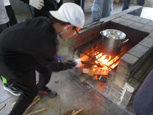 夕飯のカレーライスづくりに向け、力を合わせて火起こしです。上手に火がつきました!