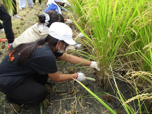 5月30日に植えた数本の苗が、立派な株に成長し、たくさんの稲穂を垂らしています!児童からの「米作りで一番大変なことは何ですか」という質問に、農家の方は、水の管理だと教えてくださいました。ほかにも、害虫・益虫のことや、米作りで使われる機械のことも教わりました。