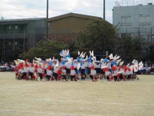 です。これは、運動会だけでなく、本校が一年間を通して掲げているスローガンです。運動会当日に向けて、どの学年も力を合わせて練習に励んでいます。このフラッグに描かれているように、手と手をとりあい、力いっぱいやり切る運動会をめざします!