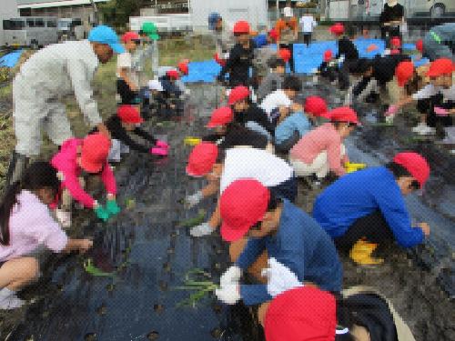 農業委員さんから植付けの仕方を教えていただき、みんなで植付けの手順を分担しながら力を合わせて大事に植え付けました。3年生の児童は、これから朝夕の水やりをしっかりと行いながら育てるのを楽しみにしているようでした。