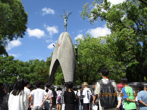 広島平和記念公園 原爆の子の像の前でセレモニー。詩を暗唱し黙祷を捧げました。
