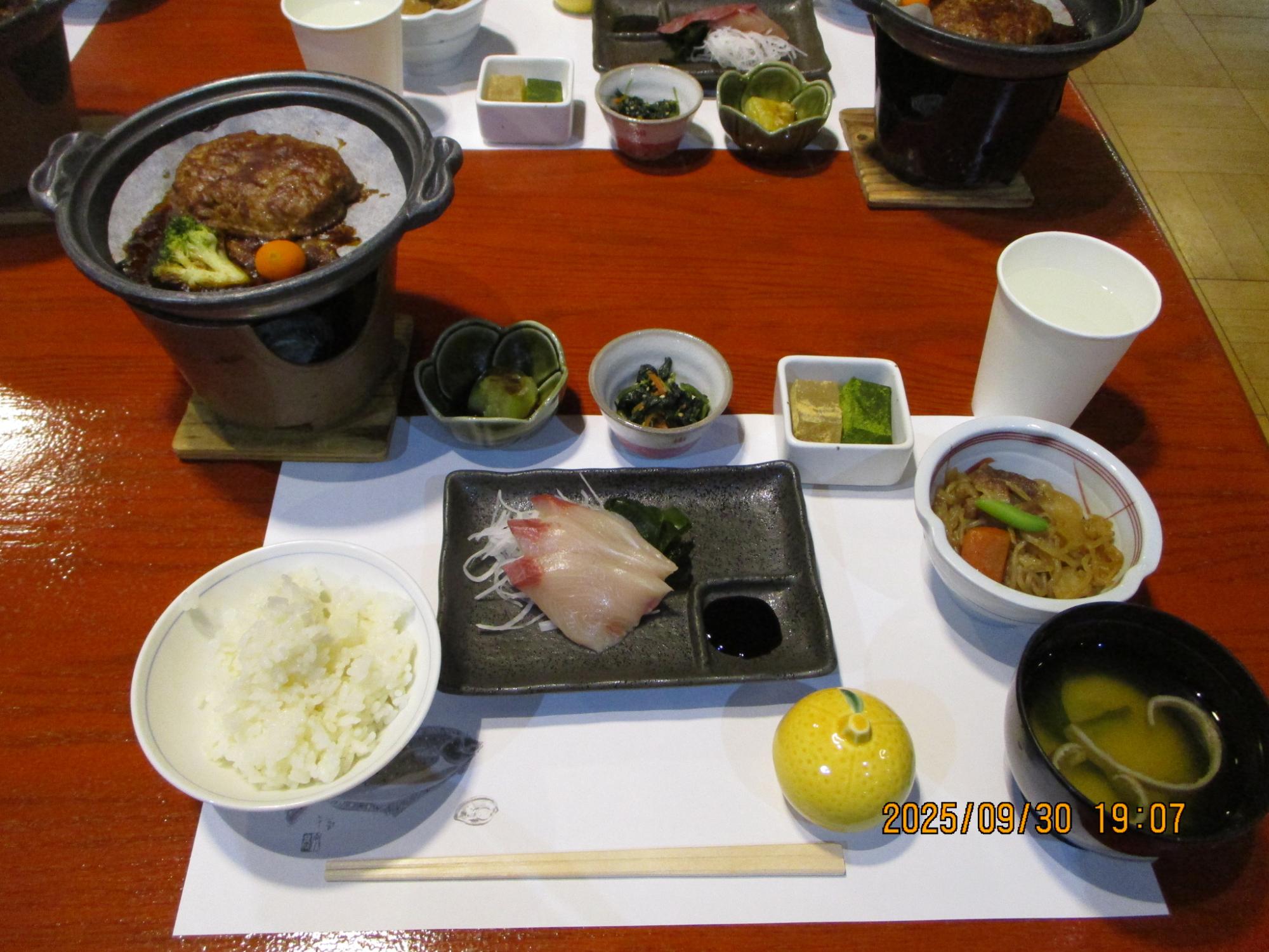 宿舎での夕食。ハンバーグ、お刺身、肉じゃがなど、美味しくいただきました。
