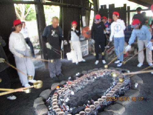 2日目は藻塩づくり体験やカッター体験をしました。炉で焼いたじゃがいもにうまみのある藻塩をつけていただきました。