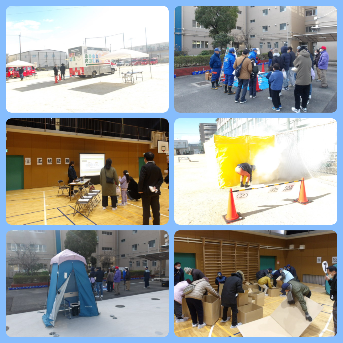 第二部の防災フェスタでは、地震振動体験や煙充満部屋体験をはじめ、防災資機材やマンホールトイレの展示、段ボールベッドの組み立て、災害ドローン展示など、さまざまな体験ブースが設けられました。子どもから大人まで、楽しみながら防災について考える機会となりました。