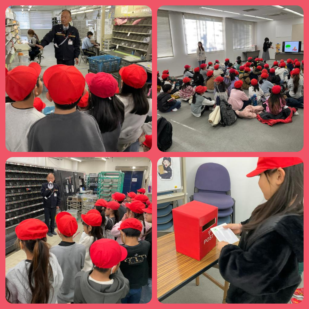 見学では、たくさんの配達物が仕分けされている様子や、職員の方がていねいに働いている姿を間近で見ることができました。また、子どもたちの質問にもやさしく答えていただき、郵便局の仕事についてよく分かりました。