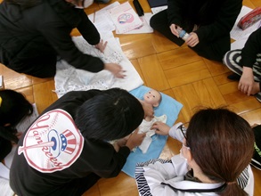 6年生が赤ちゃんふれあい体験をしました。本校育休中の先生の赤ちゃんを連れてきていただく計画でしたがインフルエンザの流行を受けてリモートで赤ちゃんが登場しました。実際のおむつ替えは人形を使って行いました。子どもたちは初めてだろうと思いますが上手に交換をしていました。