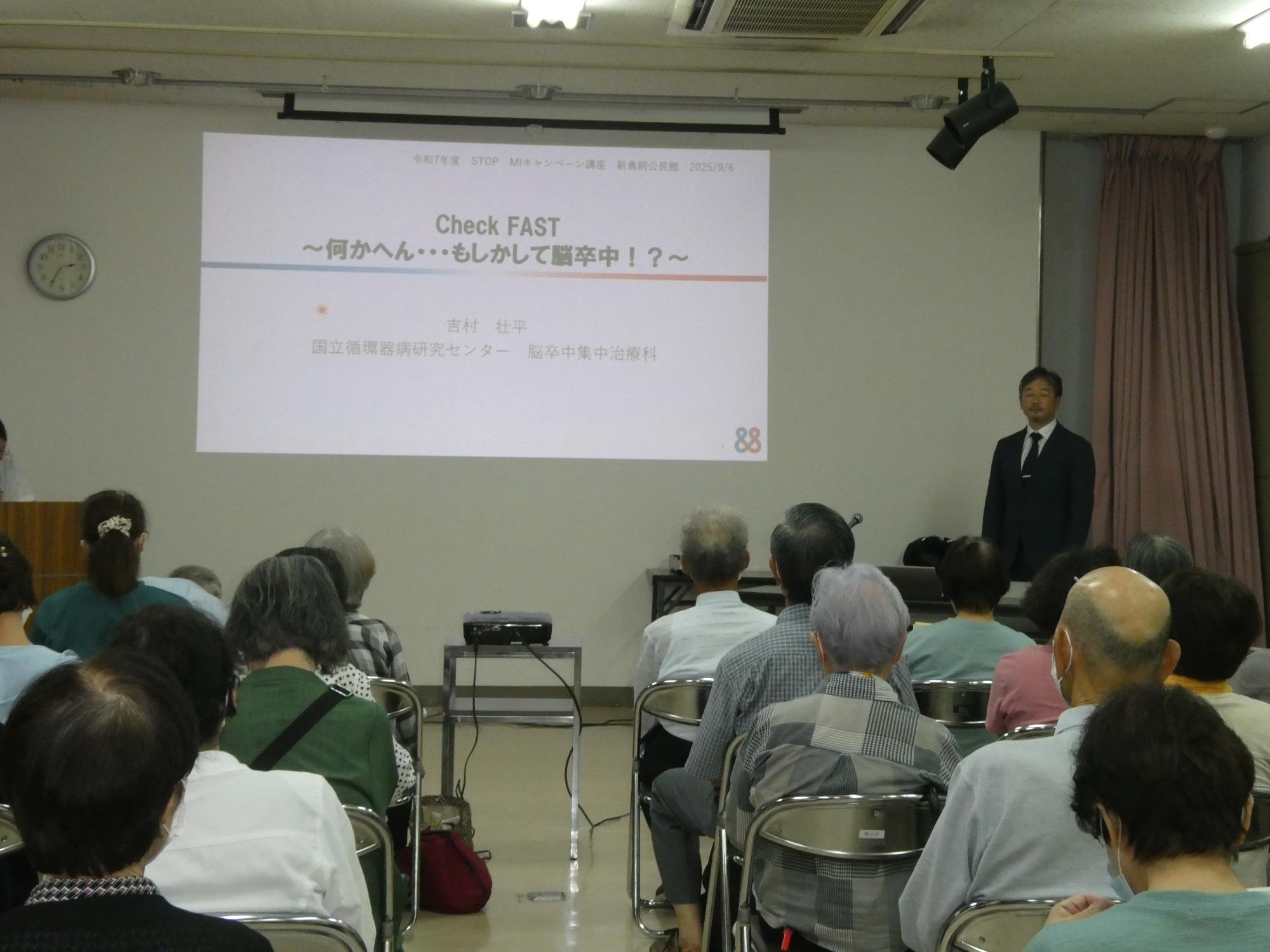 第1部では、国立循環器病研究センター心臓血管内科・救急部特任部長である田原良雄医師をお招きし、「STOP MI~心筋梗塞から大切な命を守ろう~」というテーマ、第2部では、国立循環器病研究センター脳血管内科医長吉村壮平医師をお招きし、「Check!FAST~何か変…もしかして脳卒中!?~」というテーマでご講演いただきました。当日は、78名という多くの市民の皆様にご参加いただきました。