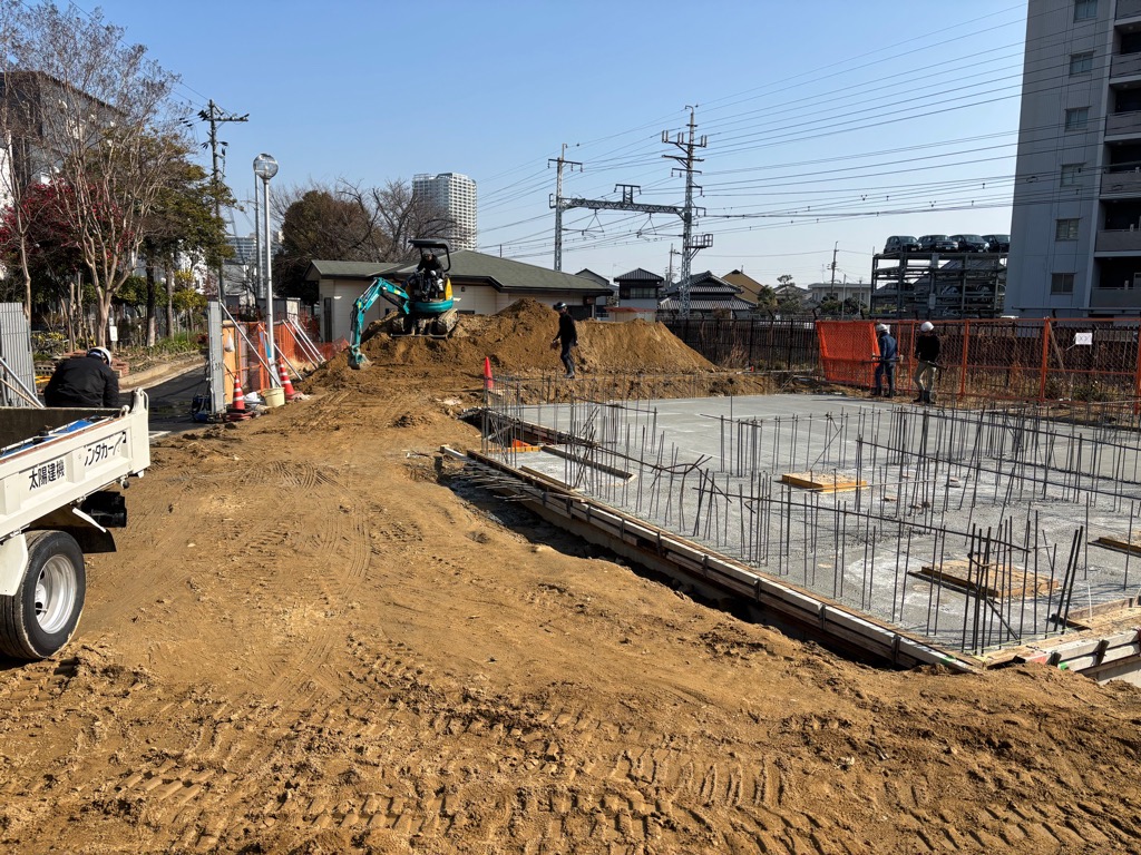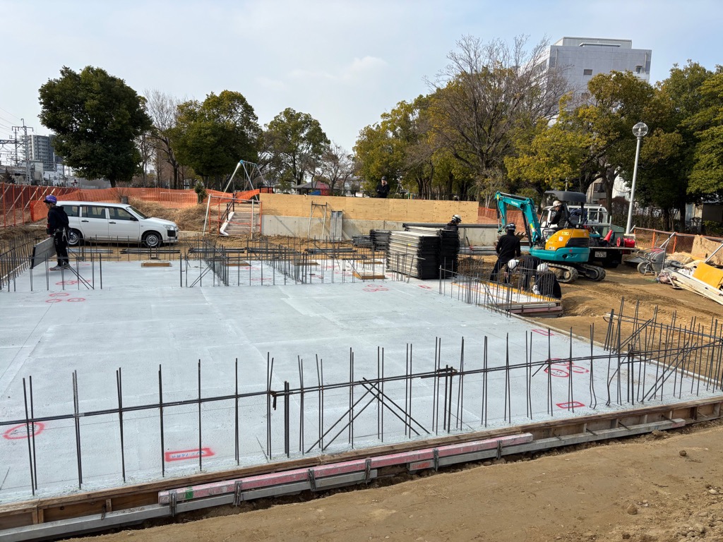 現在、新しい管理棟の土間コンクリートを打設しています。