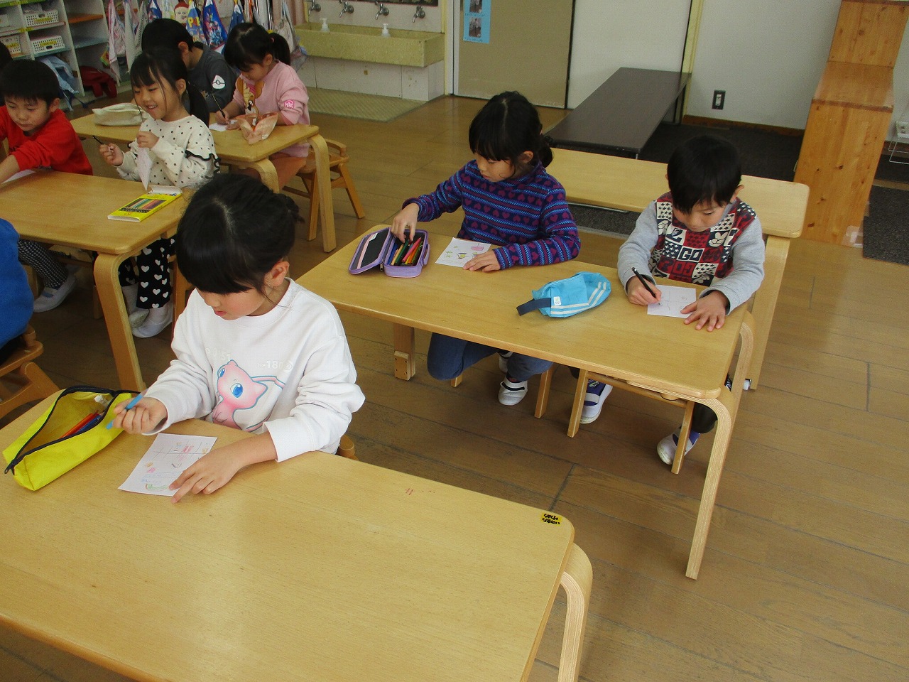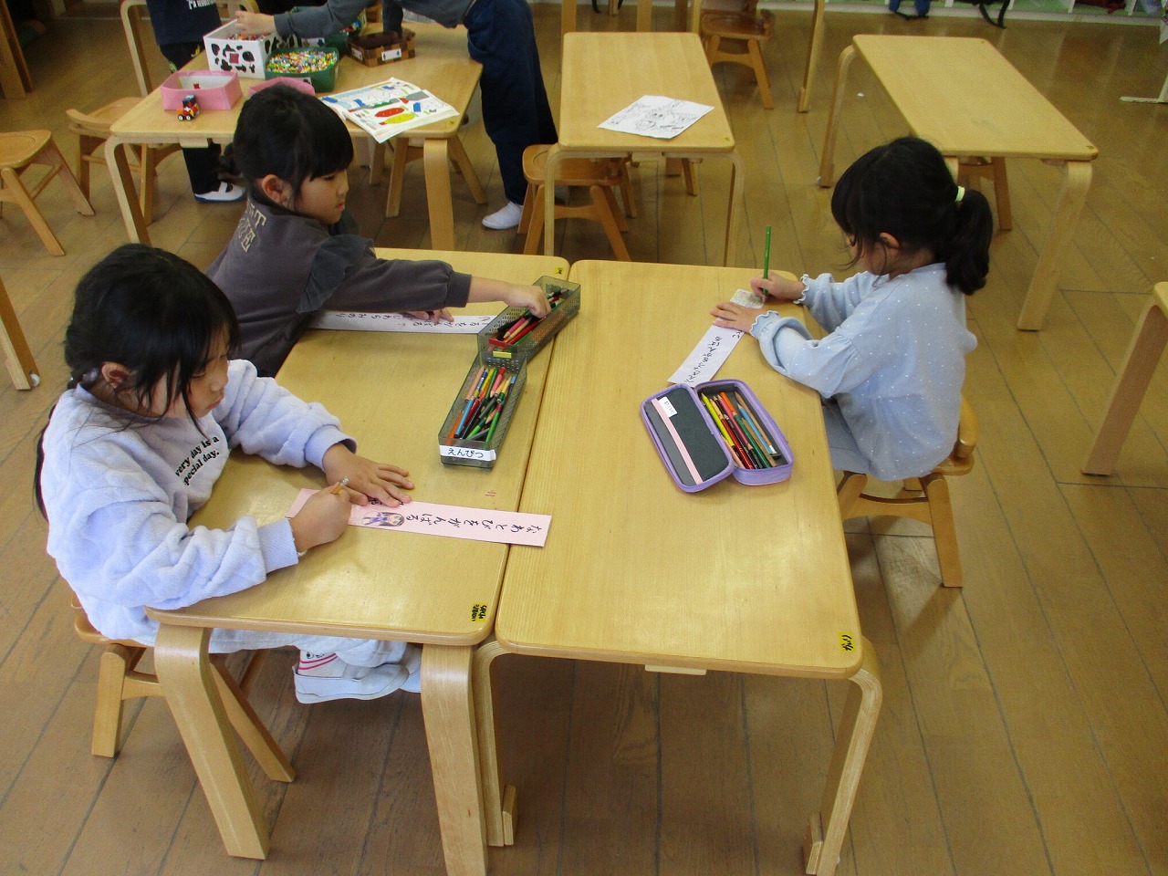 約束事をみんなで確認して早速お部屋ではがきを描きました。
