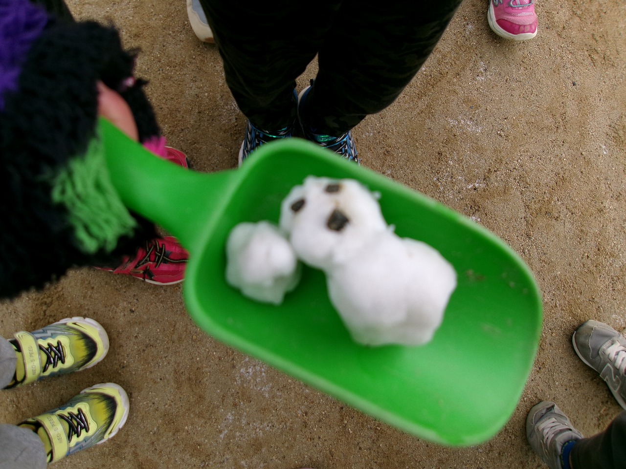 園庭の消防車にもうっすらと積もっていた雪を集めて小さな雪だるまができました。