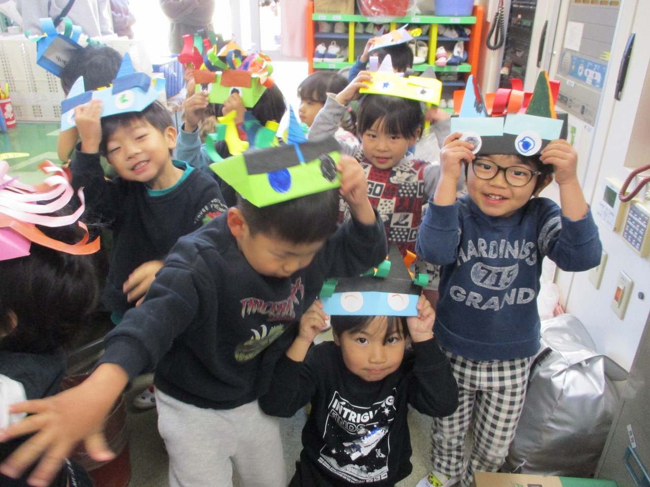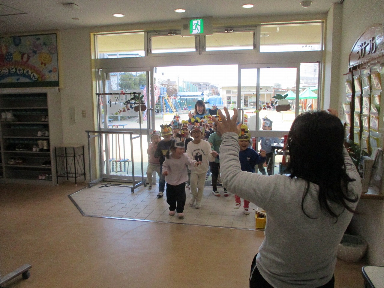 節分の集いで披露するのを待ちきれず、事務所の先生に見せに来てくれたクラスもありました。