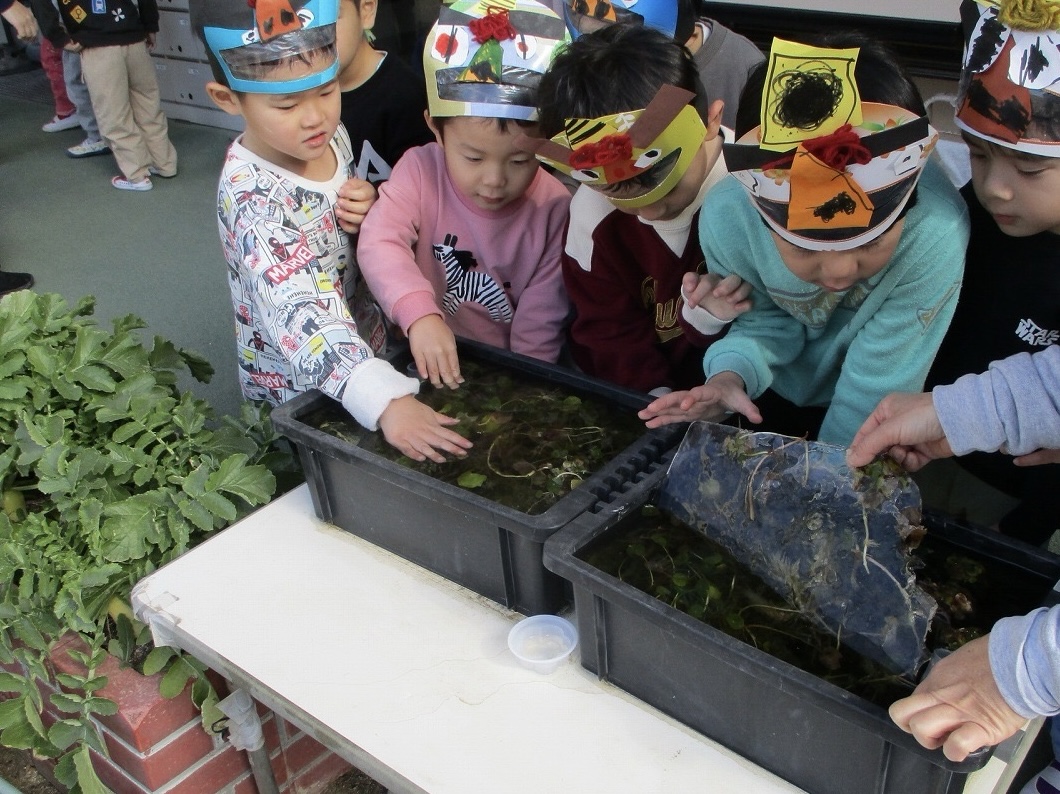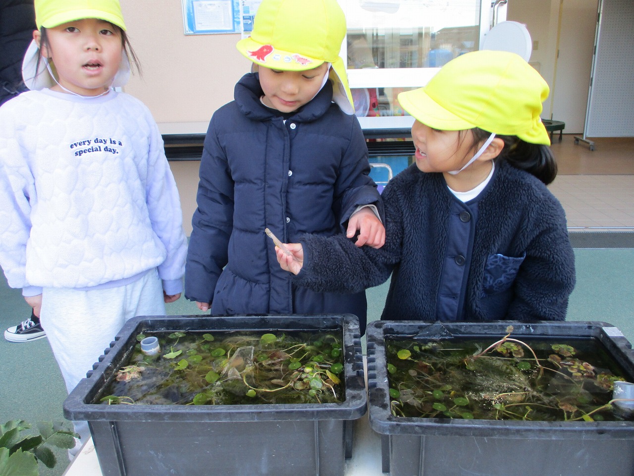 子どもたちはメダカの水槽の表面が氷っていることに気が付き、「メダカさんはどうしてるんだろう?」と心配しながらも、氷を触って「つめたーい!」と楽しんでいました。そんな氷に興味津々の子どもたちは夕方容器に水を入れて園内の色んな場所に置いておき、翌朝「氷ってるかな?」と楽しみにして登園してきました。容器や場所によって氷っていたりいなかったり・・・自然の不思議に触れた体験となりました。