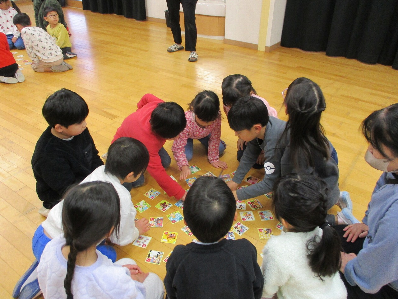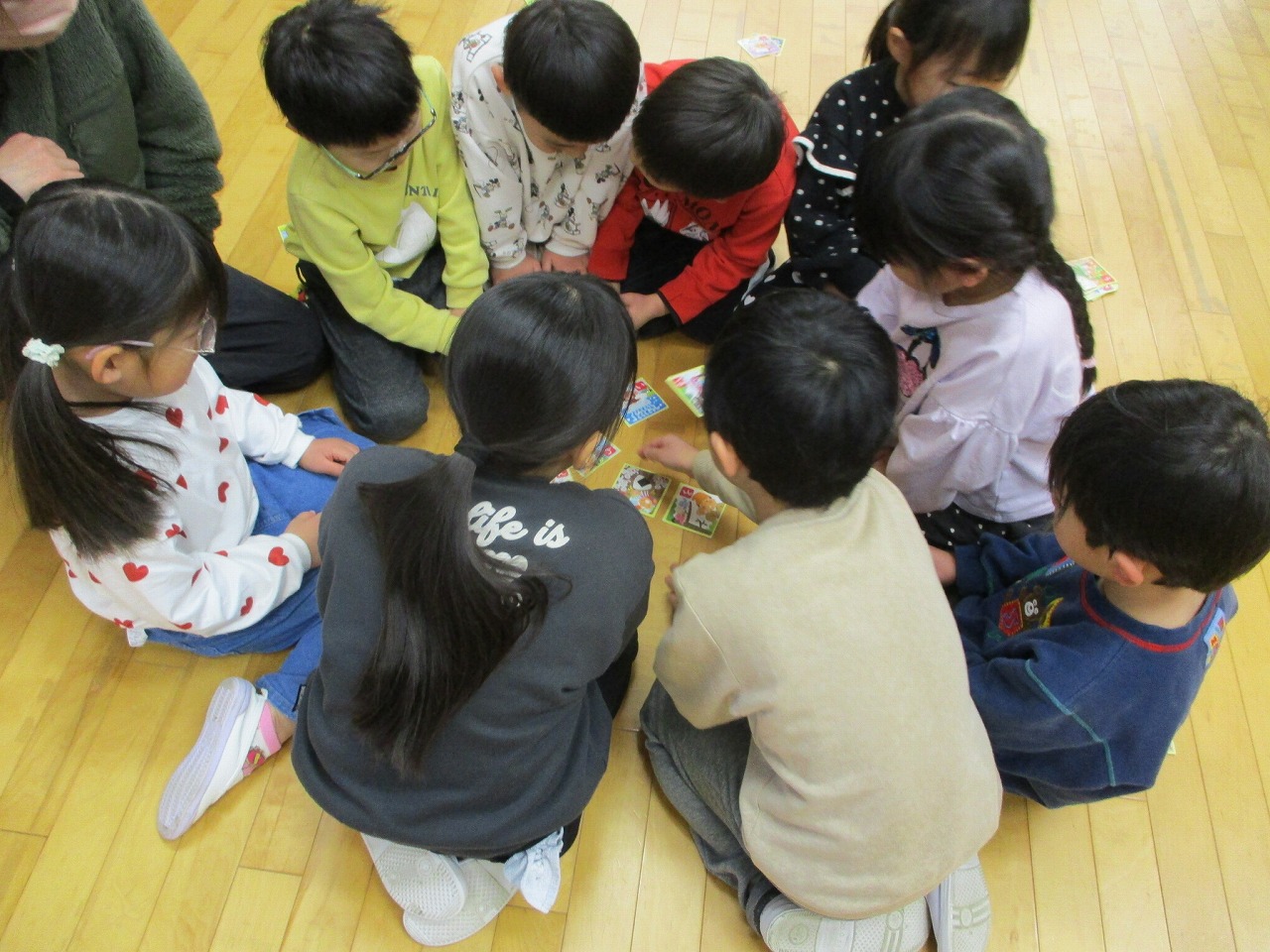 輪になって正座で読み札が読まれるのをじっと聞いて、大きな声とすごい勢いで「はーい!」と札をとっていました。一生懸命札を探すため、だんだん輪が小さくなっていく姿がおもしろかったですよ。