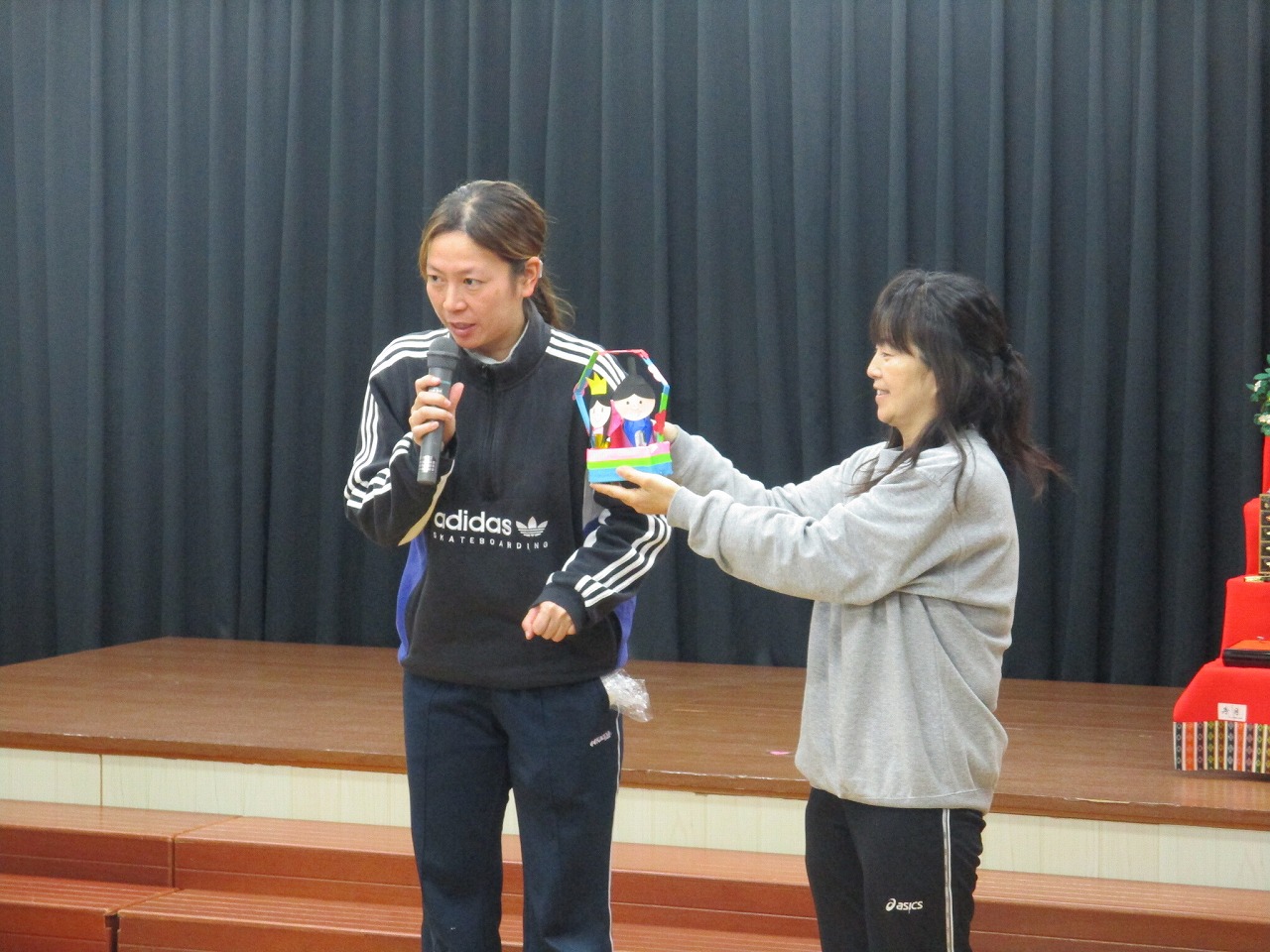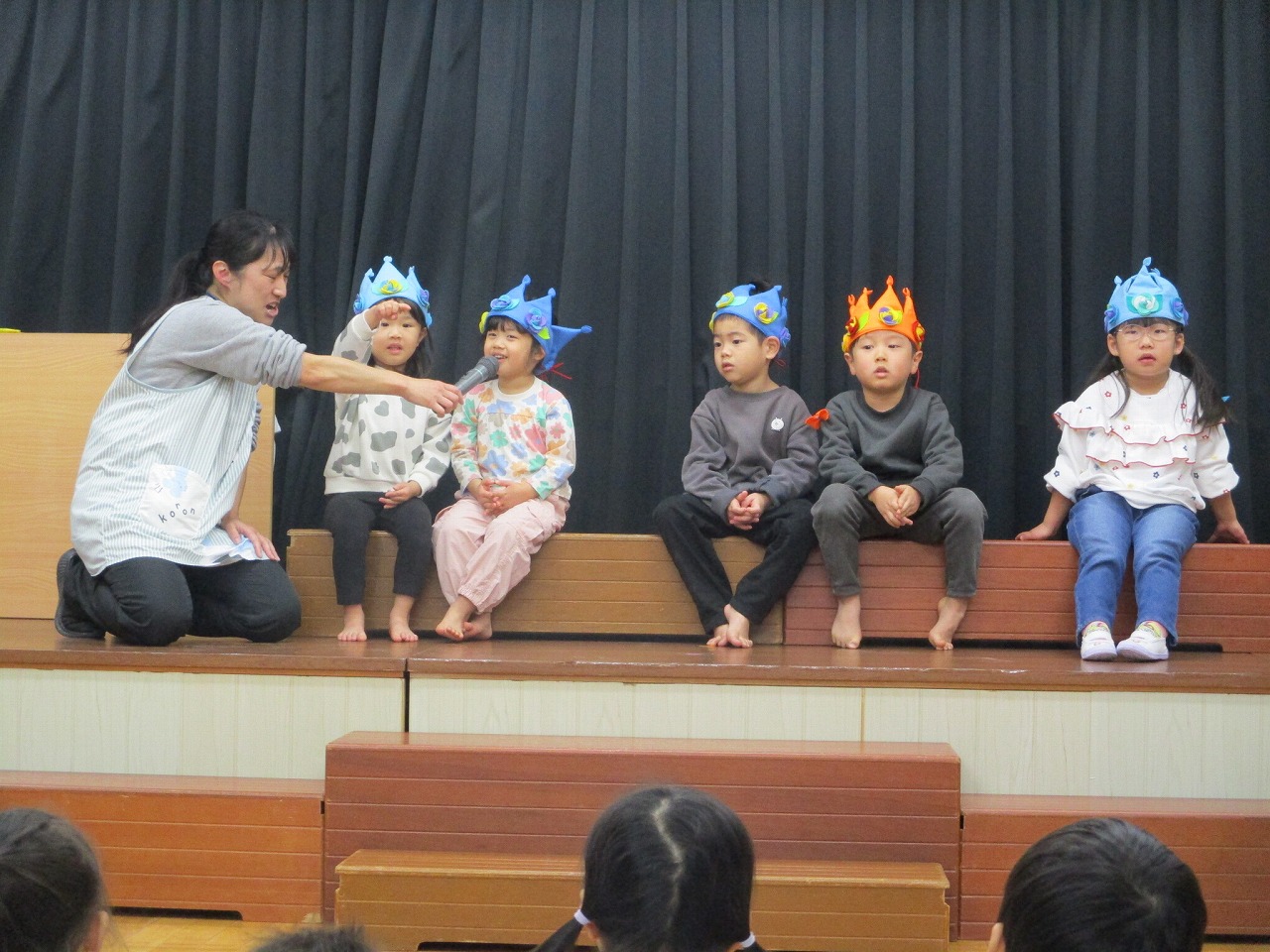 そらまめさんの絵本読み聞かせの後、誕生児が舞台に上がりインタビューを受けました。5歳児クラスの誕生児は得意技も披露しました。