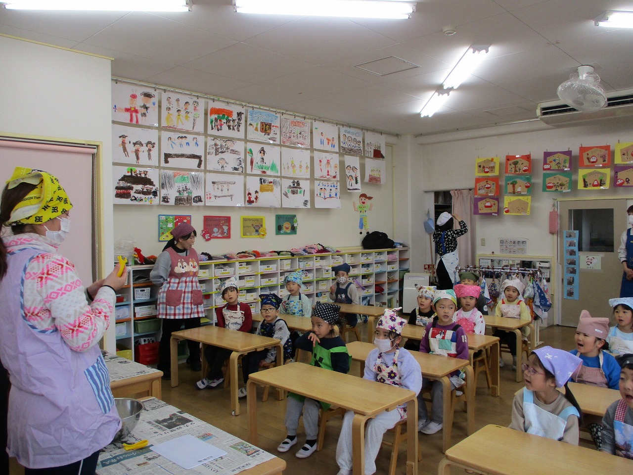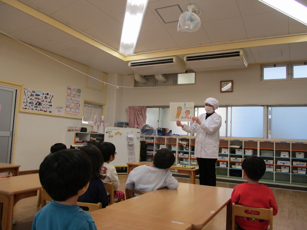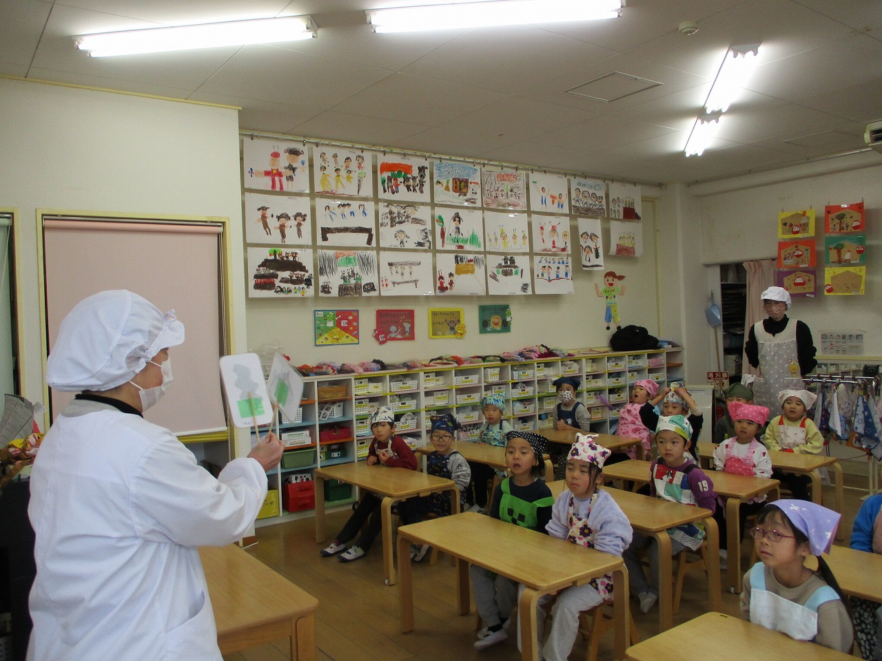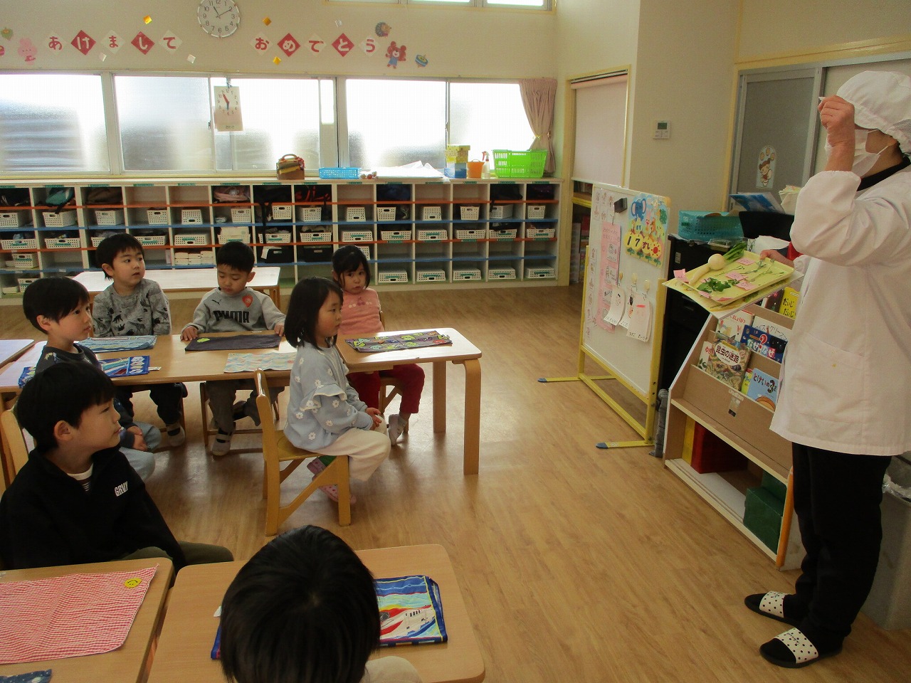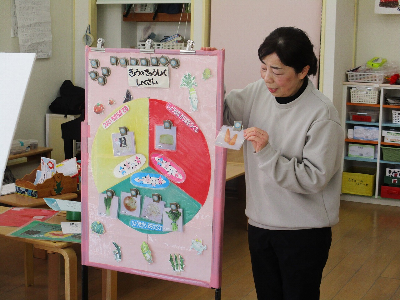 5歳児クラスに調理の先生が出向き、三食栄養の食育をしてくれました。