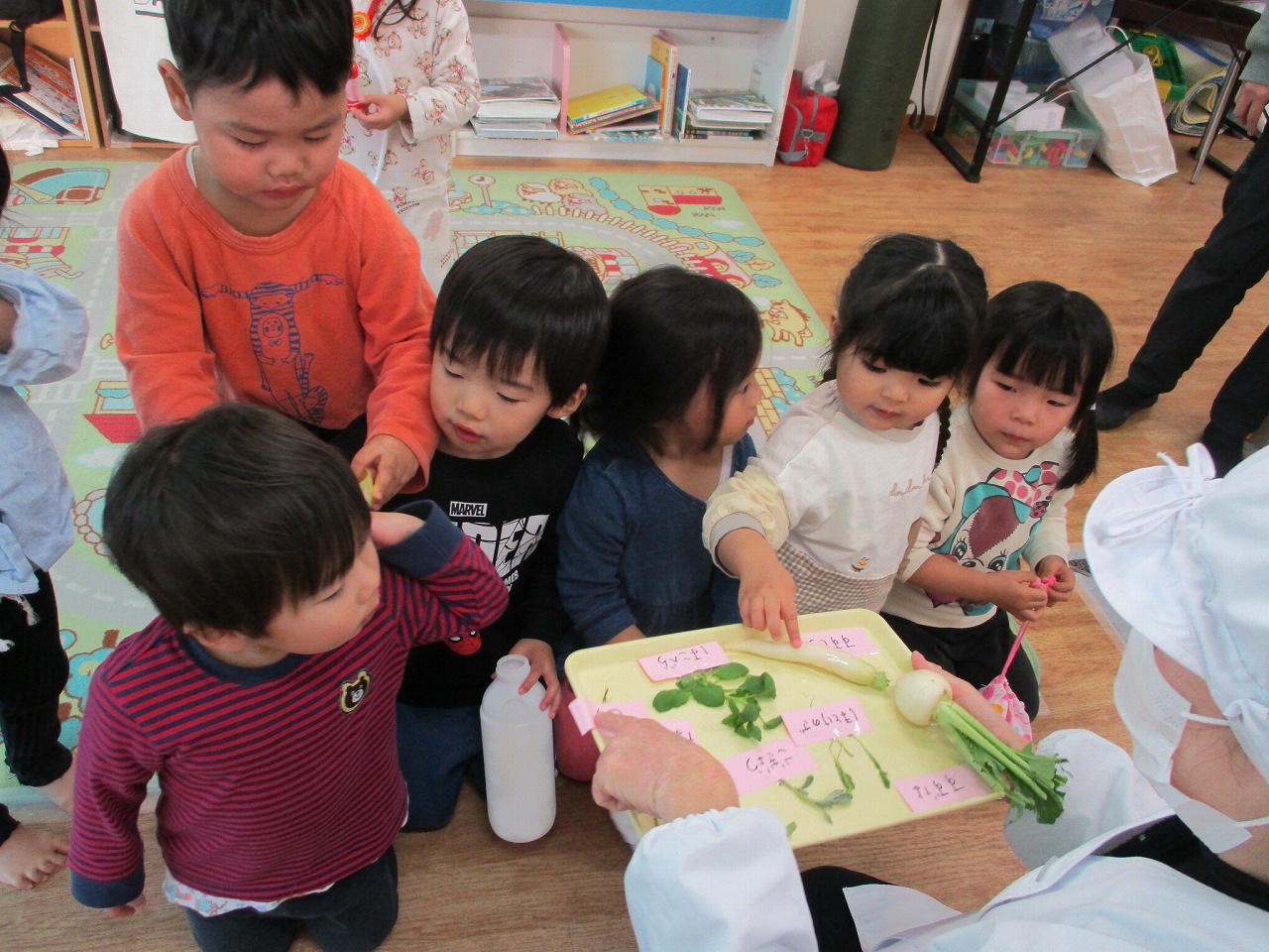 紙芝居を読んで七草がゆの由来や食べる意味等を伝えた後、七草を実際に触り、匂いを嗅ぐなどして一年間元気に過ごせるように願いを込めて食べることも知りました。