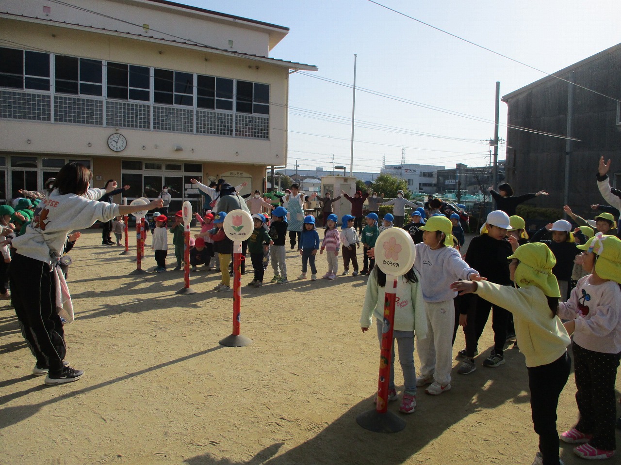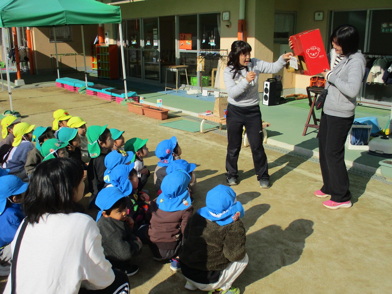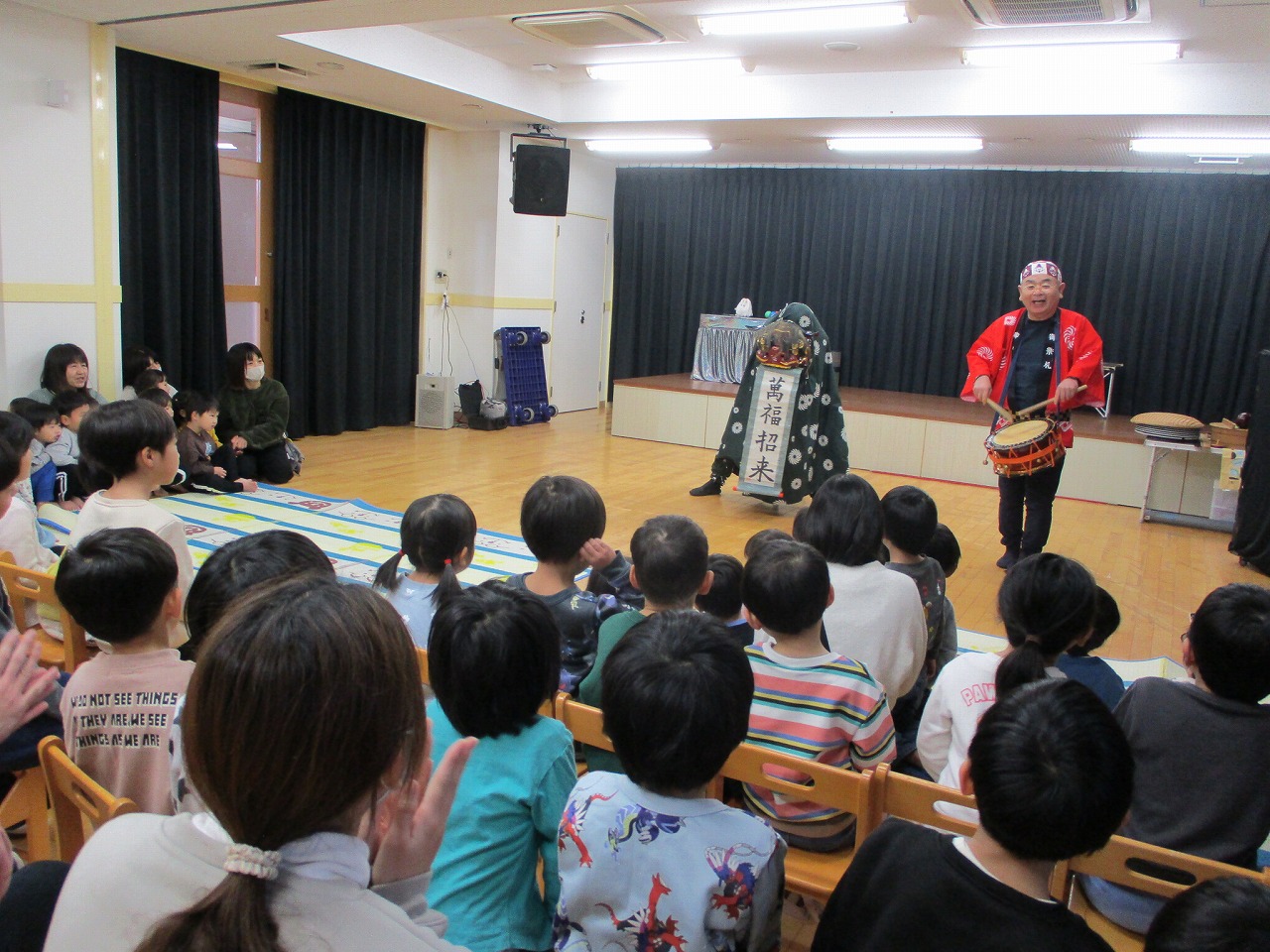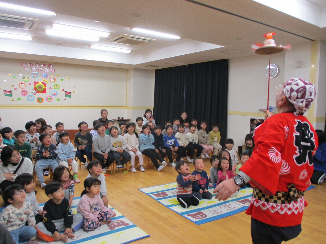 2日目は”遊びの玉手箱”に来ていただき、本格的な獅子舞や皿回し、ジャグリング、中国ごまの演技を観ました。お獅子さんがお酒を飲んで寝ている間に子どもたちが獅子の頭をなでなでしたり、光る中国ごまの演技に「すごーい!」「かっこいい!」と目をキラキラさせて見入ったりしていました。