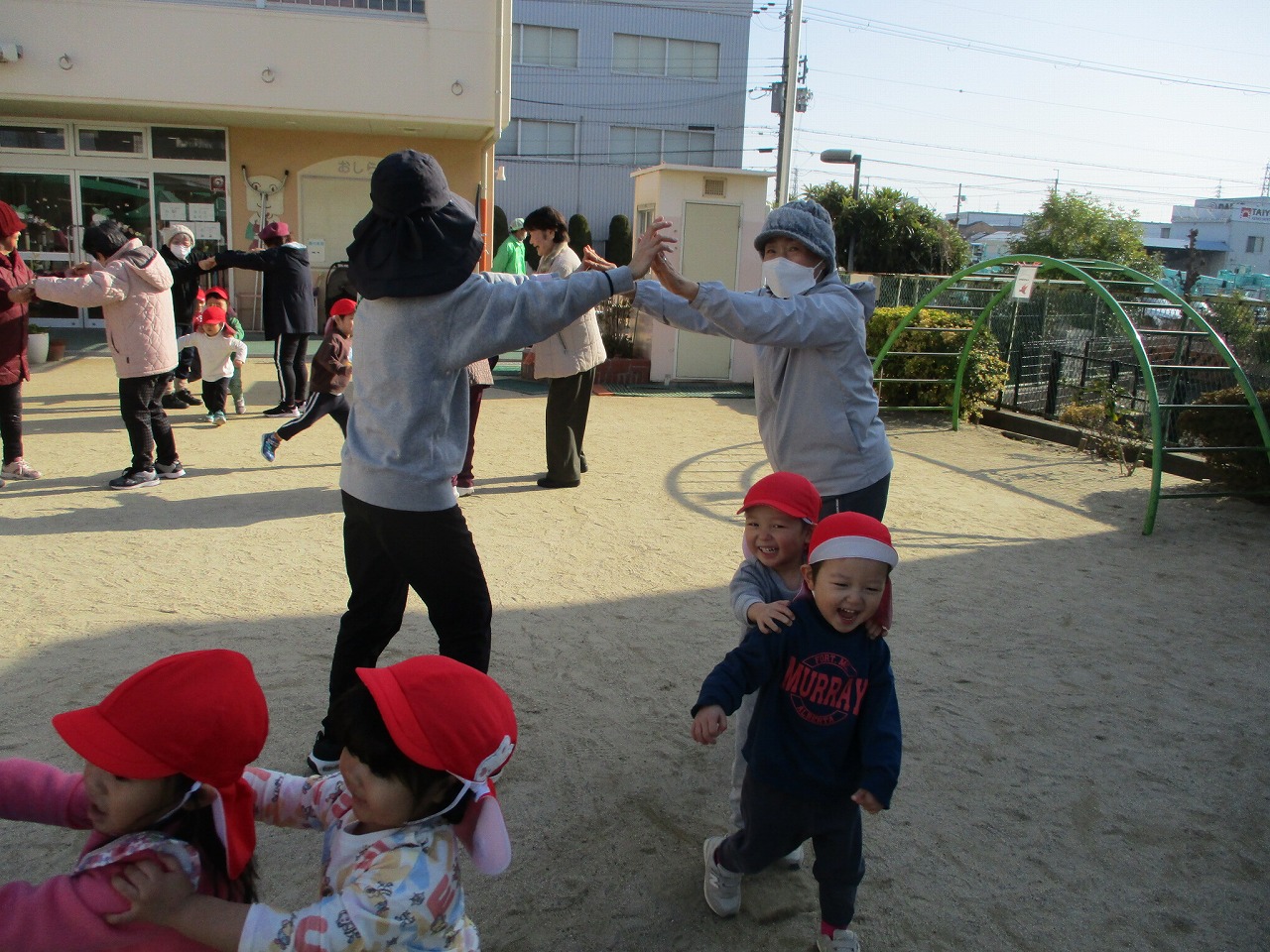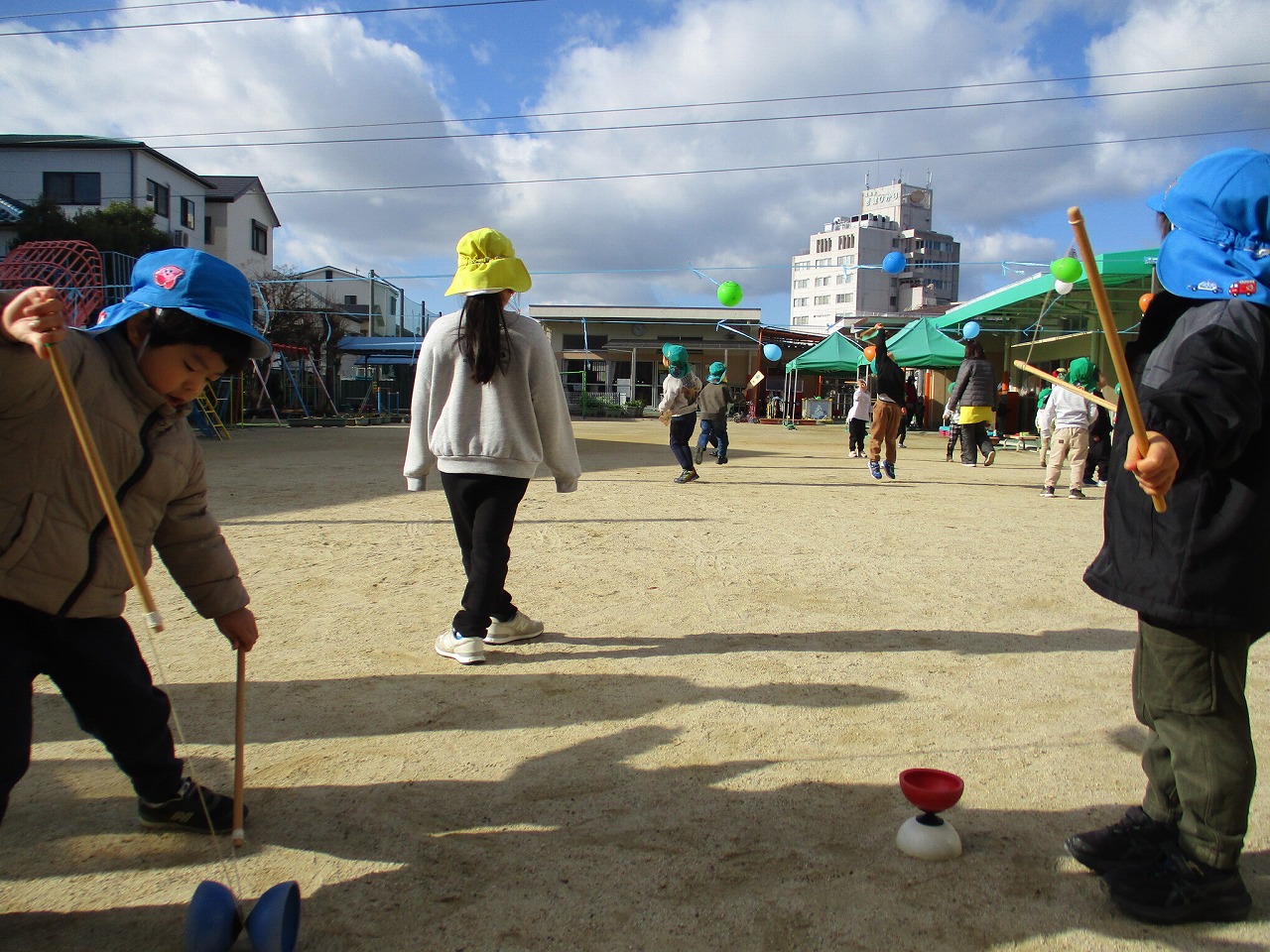 1日目は始業式を行い、冬休み明けの登園児もいたため、みんなで「あけましておめでとうございます」の挨拶から始めましたよ。職員が獅子になって踊ったり、幼児クラスの子どもたちには担任の先生から年賀状が届いたりもしました。その後はかるたや福笑い、すごろく、こま、羽根つき、皿回し等お正月らしい遊びをそれぞれ好きな遊びを選んで友だちや先生と楽しみました。