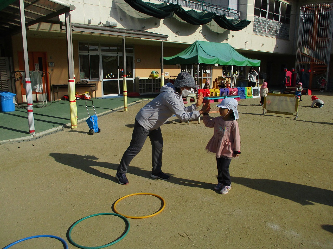 幼児クラスのサーキットでは要所に待機していただき、子どもたちにハイタッチしていただきました。