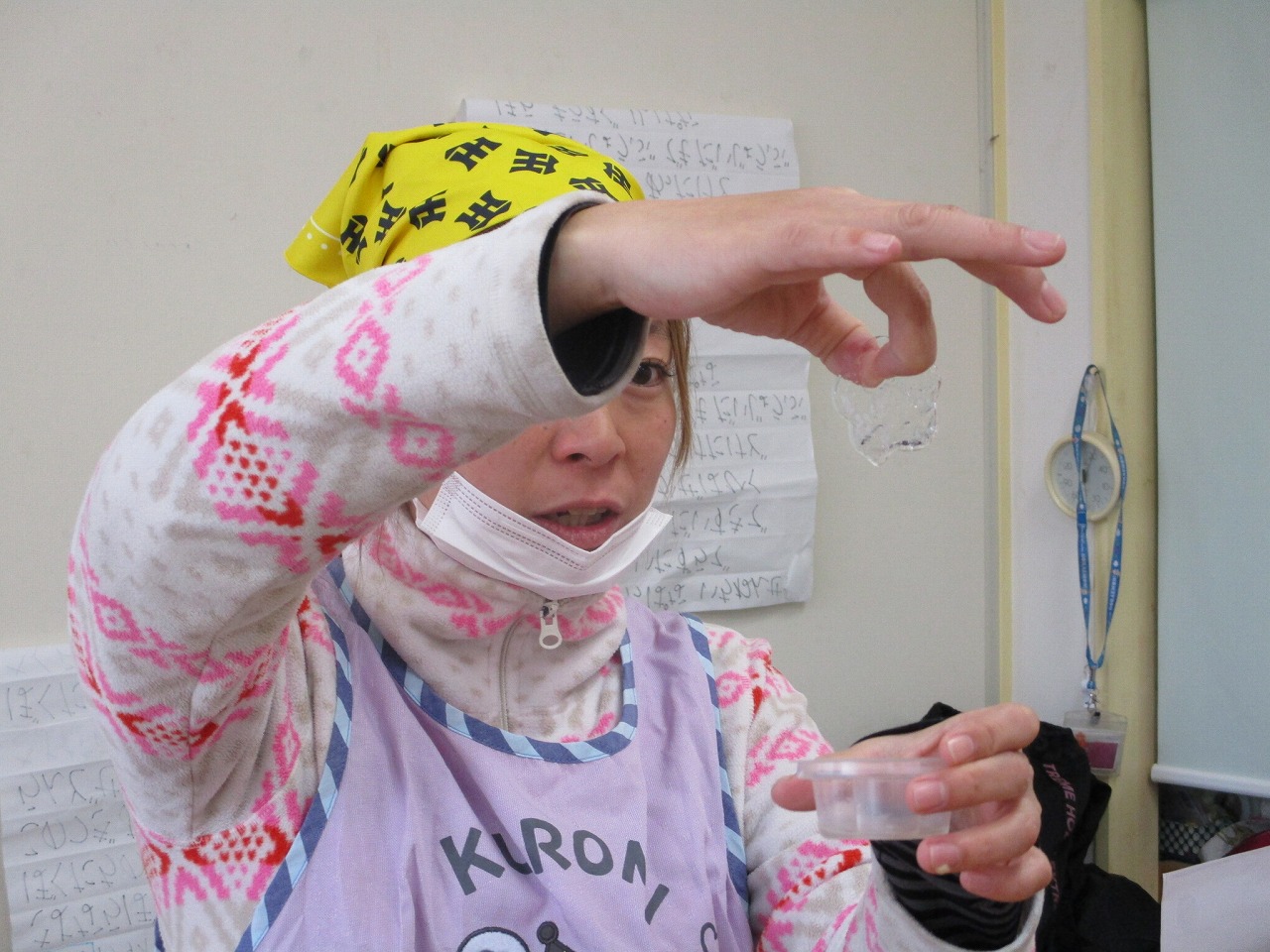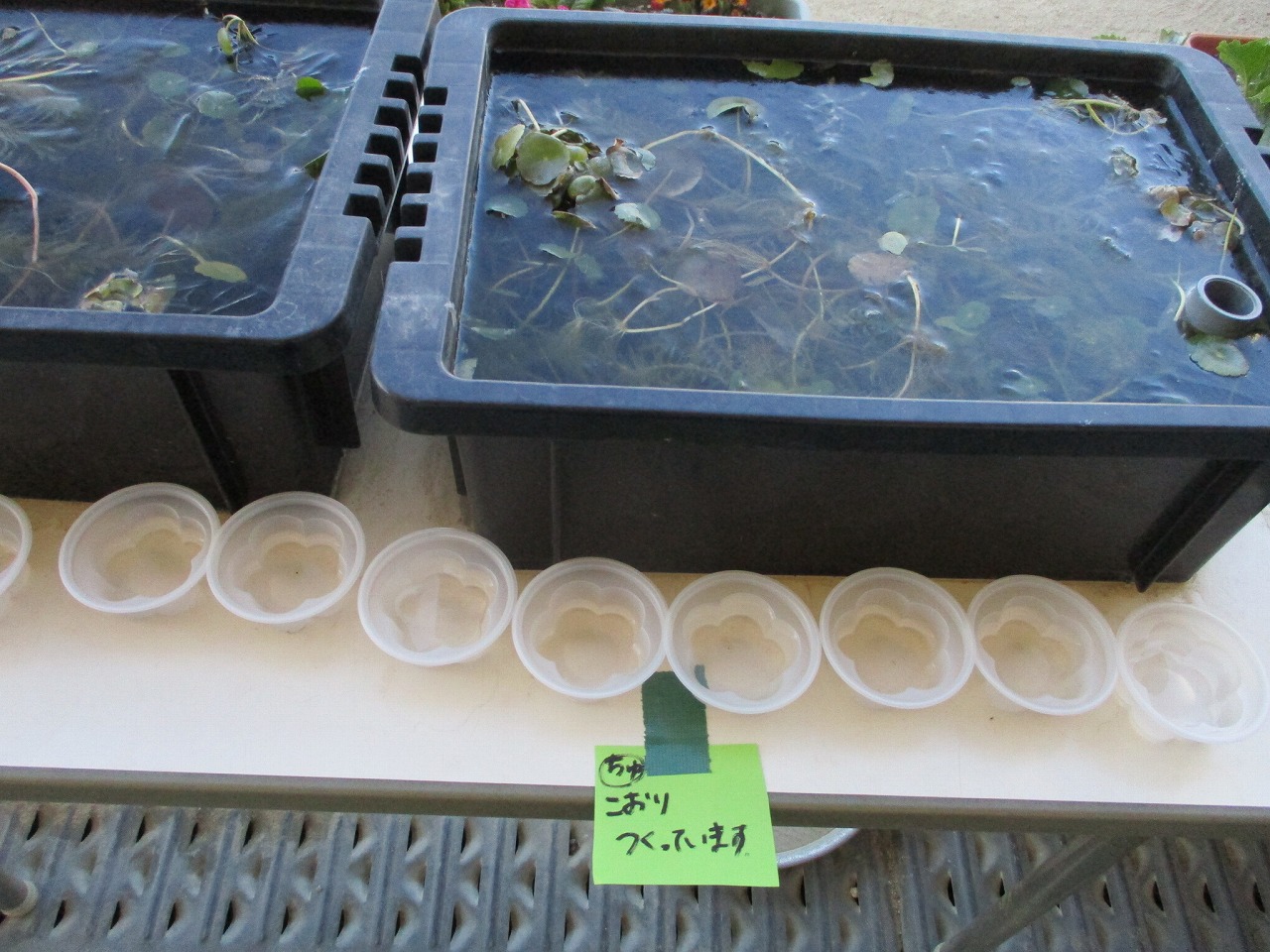 容器に水を入れて実験!氷るかな?と翌日楽しみに登園した子どもたち。