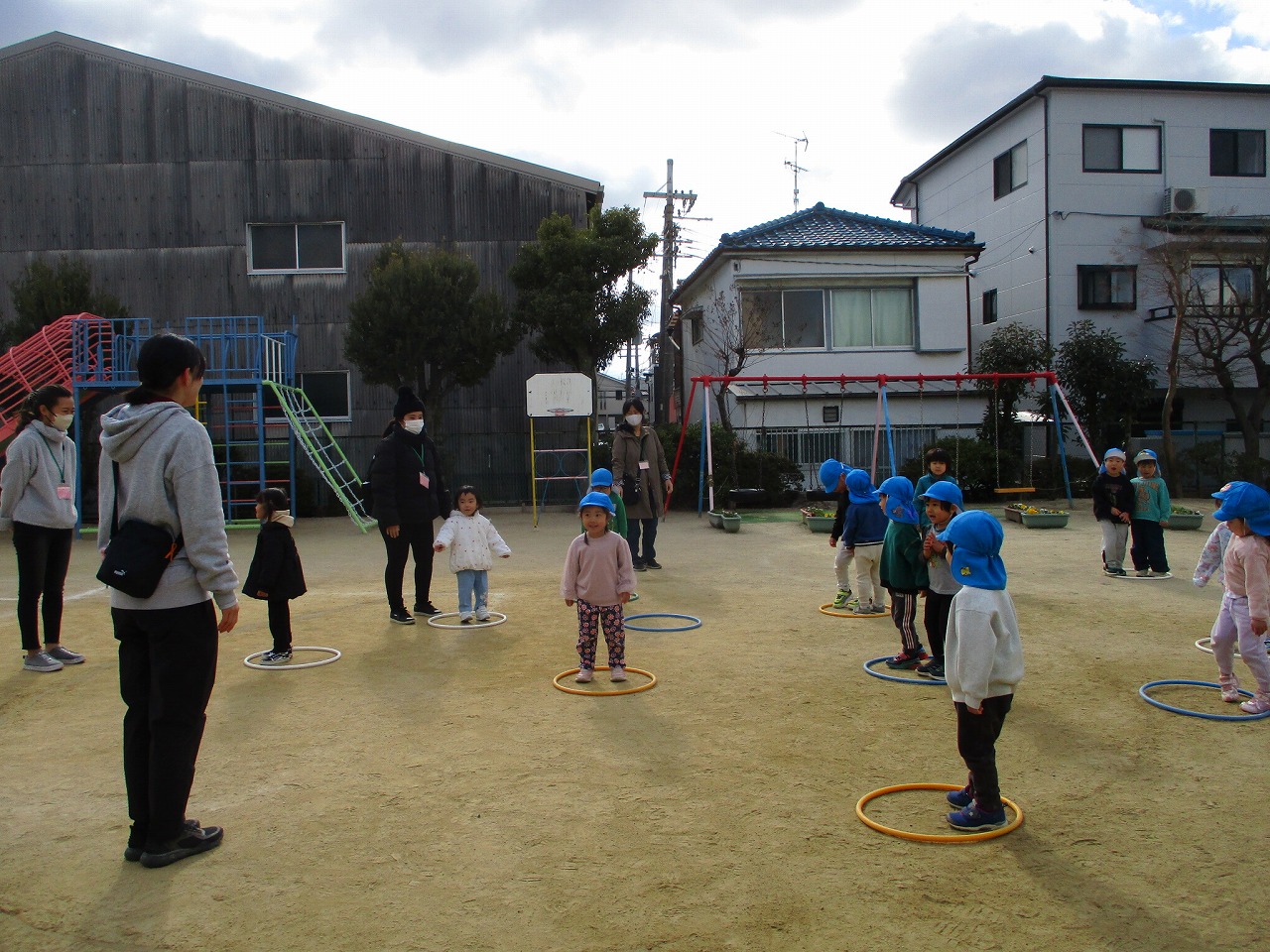 お家の人が見守る中先生の声掛けに合わせて上手にフープに入っていました。その後の園庭での自由遊びの時には「一緒に遊ぼう」と誘い合って、一緒にスクーターに乗って遊ぶ子もいましたよ。