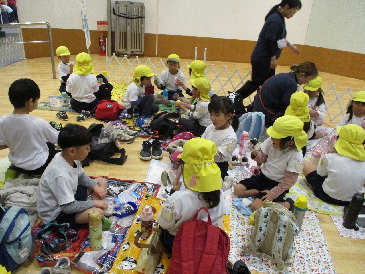 「僕のおにぎりの中、ウインナー入ってるねん!」「おいしいね~」とお家の人が作ってくれたおにぎり弁当を喜んで食べている5歳児です。朝からお弁当作りありがとうございました