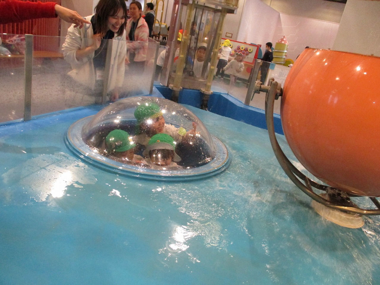 右のオレンジのカップに水がいっぱいになると「バッシャーン」と覗いているみんなの所にお水があふれ出す仕組み。濡れないけどお水をかぶるドキドキ感がたまらない!